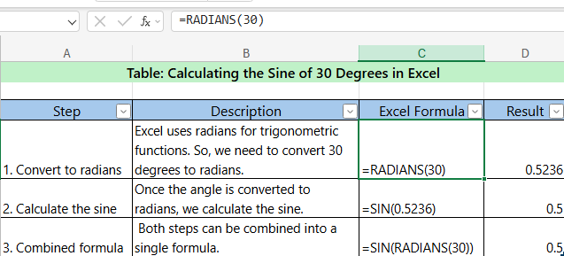 - =SIN(RADIANS(30)) // Result : 0.5